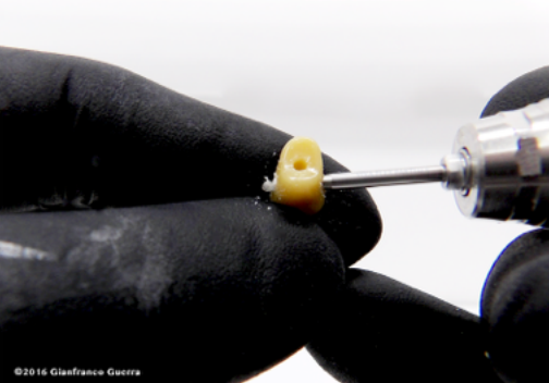 Použijte tvrdokovovou kuličku 0,9 - 1,2 mm a vytvořte dírku a takzvaný T tvar na spodní straně zubu.